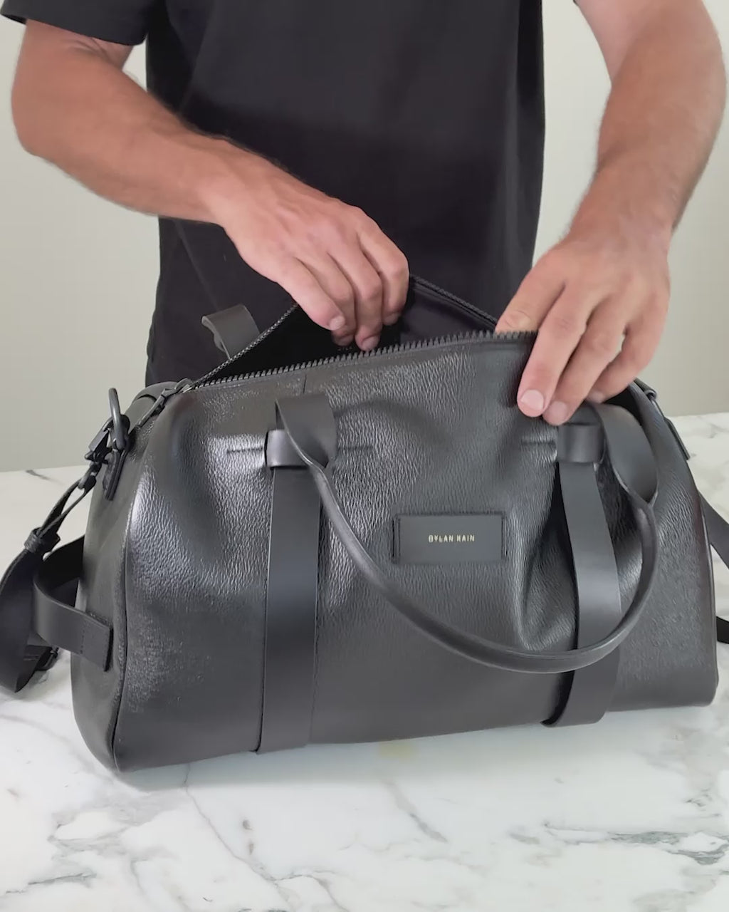 Crafted from premium Italian pebble leather with smooth veg-tan contrast, the Tour Duffle is your elevated overnight bag.